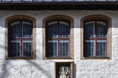Les fenêtres à remplages néo-gothiques ont remplacé les baies baroques au début du 20ème siècle Die neugotischen Maßwerkfenster ersetzten im frühen 20.Jht die ehemaligen Barockfenster Neo-Gothic tracery windows replaced Baroque windows at the beginning of the 20th century