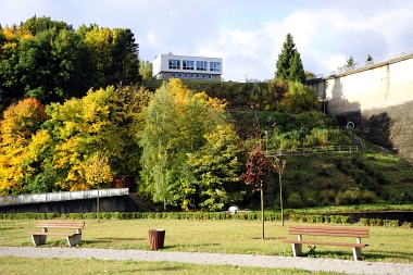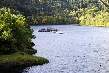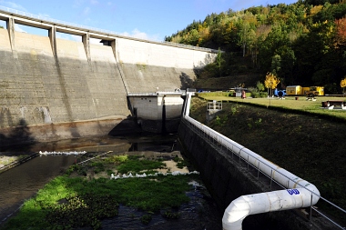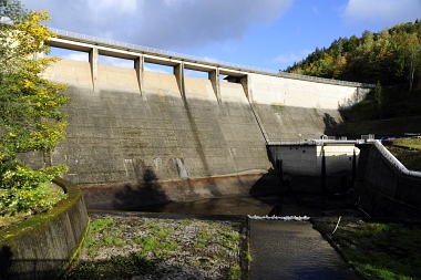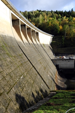 Le barrage sert contre les inondations, pour la baignade, l'élevage de poissons et d'usine de pompage Die Talsperre dient als Hochwasserschutz als Badesee, der Fischzucht und als Pumpspeicherwerk A barrage for flood control, as a bathing lake, fish-farming and pump storage station