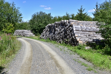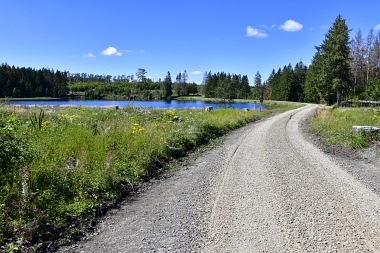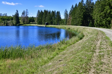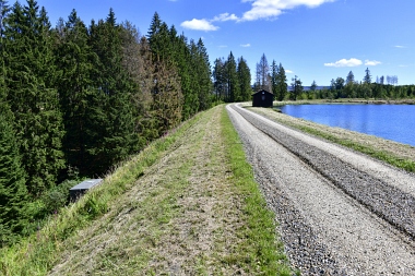 Sur la digue de l'étang - Longueur 310 m - Hauteur 14,33 m Auf dem Teichdamm - Länge 310 m - Höhe 14,33 m On the dam - Length 310 meters - Height 14,33 m