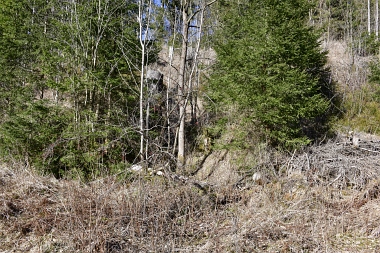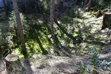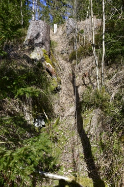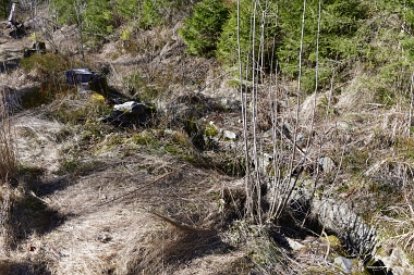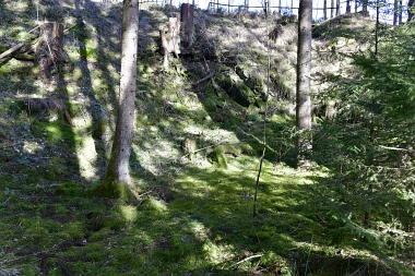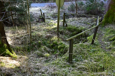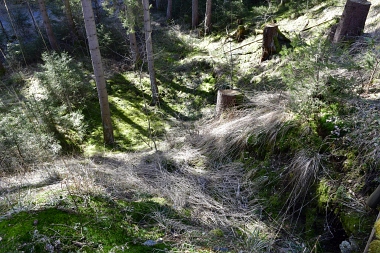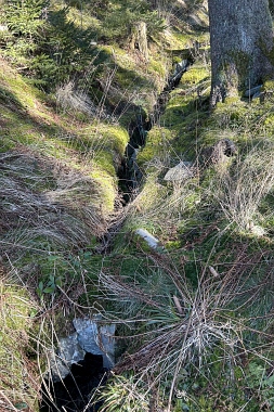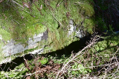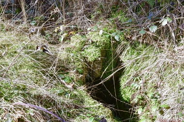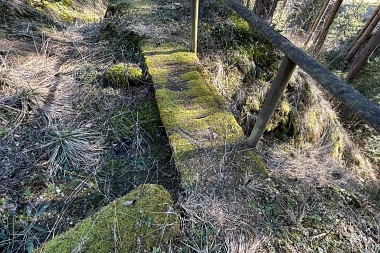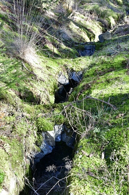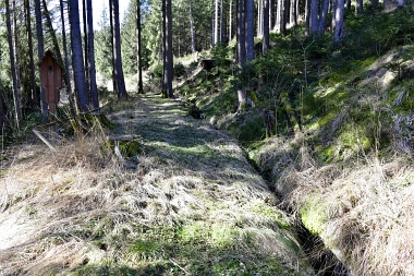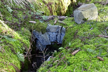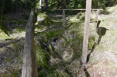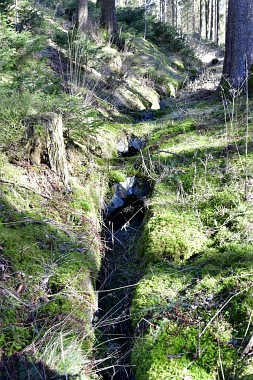 Ce fossé amenait l'eau de la roue d'extraction à double aubes à la prochaine pièce à roue In der Auslaufrösche floss das Abfallwasser nach Antrieb des Kehrrades in den Graben zur nächsten Radstube Here flowed the water from the extraction water wheel to the next wheel room |